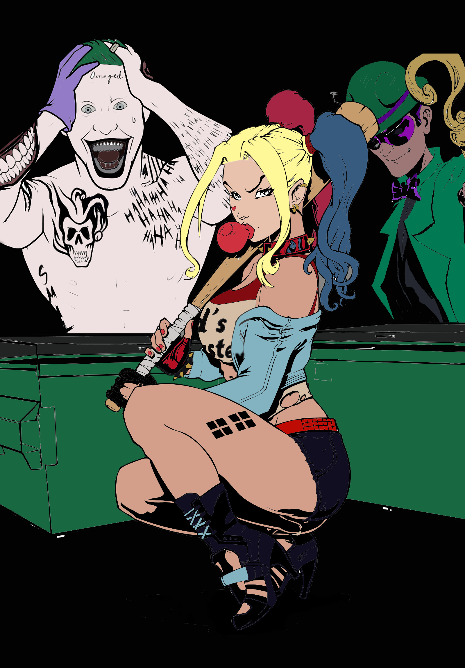 I know the Riddler doesn’t really fit in the Joker and Harley Quinn timeline so this may drive mega batman and Gotham fans crazy but I thought it would be cool to have three of batmam’s Nemeses in one image. Sorry I ran out of room for panguin.